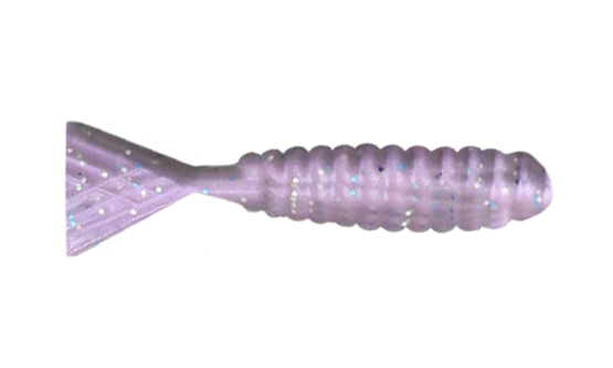 This Guppy Gobbler has a light violet color with blue and white sparkles and has a translucent tail.
