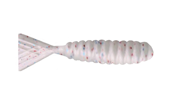 This Guppy Gobbler has a off white with red, white and blue sparkles throughout the body and tail.